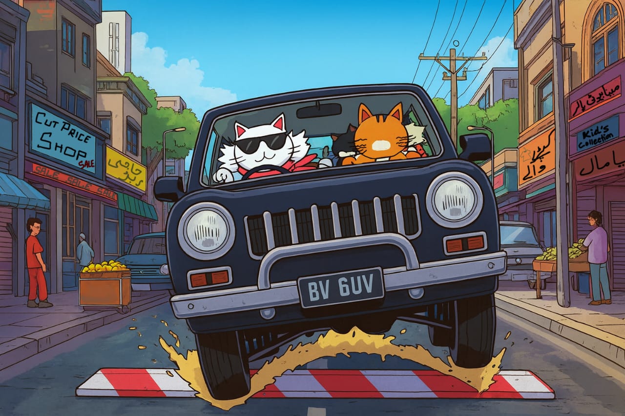I started the car, and then we drove off at full speed. When we got near a police check post, we saw the police, so I asked the cats to slow down and hit the brakes.